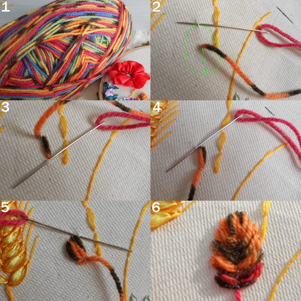 5. Укладываем стежки от центра листка к контуру и обратно. Поочередно с разных сторон от центра. Уменьшаем стежки, приблизившись к основанию листка.