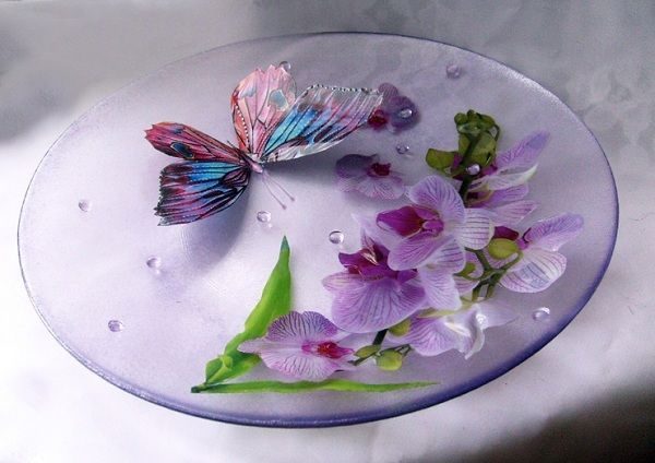 Эта техника подходит только для прозрачных стеклянных поверхностей. Чаще всего ее применяют для декорирования тарелок, которыми планируют пользоваться в дальнейшем по их прямому назначению.