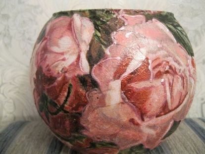 Далее все просто аккуратно приклеиваем салфетки и даем поверхности высохнуть. Чтобы рисунок был более красивым, можно выделить контуры специальными красками. Потом готовую работу нужно покрыть лаком, можно сделать несколько слоев.