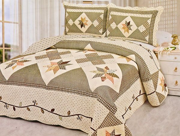 Стандартный размер покрывала — 1,5 х 2,3 м. Исходя из этого, понадобится полотно такого же размера, оно станет изнаночной стороной изделия. Далее — 60 квадратных лоскутков со стороной 23 см.Наполнитель (полиэстер или синтепон) размером 1,3 х 2,1 м. А также нитки двух оттенков: в цвет изнанки и в тон доминирующего в лоскутках цвета.