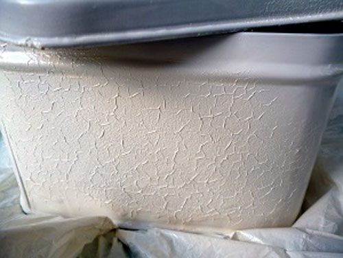 Тем временем, подсохла краска на коробке. Наносим второй слой, чтобы скрыть проступающее изображение. Здесь я вынуждена сделать одно замечание: если вы хотите получить гладкую крашеную поверхность, плотнее закрывайте двери и окна. Я красила на открытом воздухе, в результате неожиданно для себя получила кракелюр (трещинки на красочном слое поверхности).