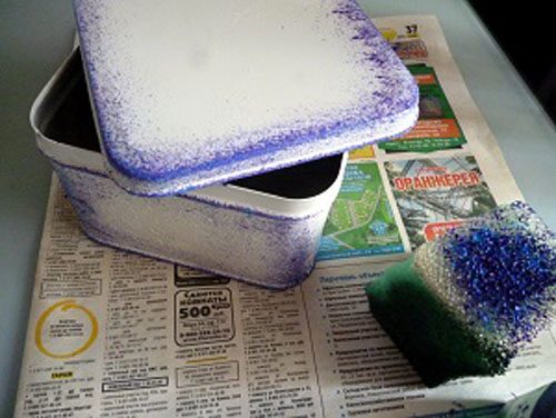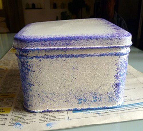 В данном случае мой недочет только добавил очарования коробке. Во всех же остальных случаях будьте осторожны со сквозняками. Чтобы краска на металле не начала отслаиваться, я нанесла поверх слой лака на водной основе. Когда лак высох, я приступила к тонированию поверхности.