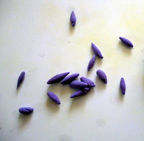 Лепим в произвольной форме сиреневые капельки. Просто берем и маленький кусочек глины, чуть больше спичечной головки и раскатываем его на ладошке указательным пальчиком. Совет: за один раз лепите не более 10 штук. Глина быстро сохнет, и с ней трудно будет работать.