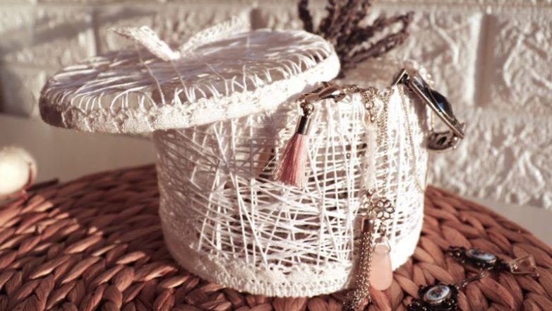 Удивительно простая и красивая поделка получается из толстых ниток, клея ПВА и кружева. Она кажется абсолютно невесомой, смотрится элегантно и оригинально. Главное, что сделать такую коробочку для хранения можно довольно быстро!