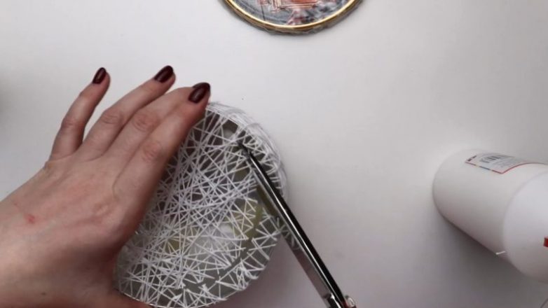 То же самое проделайте с крышкой: оберните её пластиковым пакетом, обмотайте нитью, пропитанной клеем ПВА, дайте высохнуть.