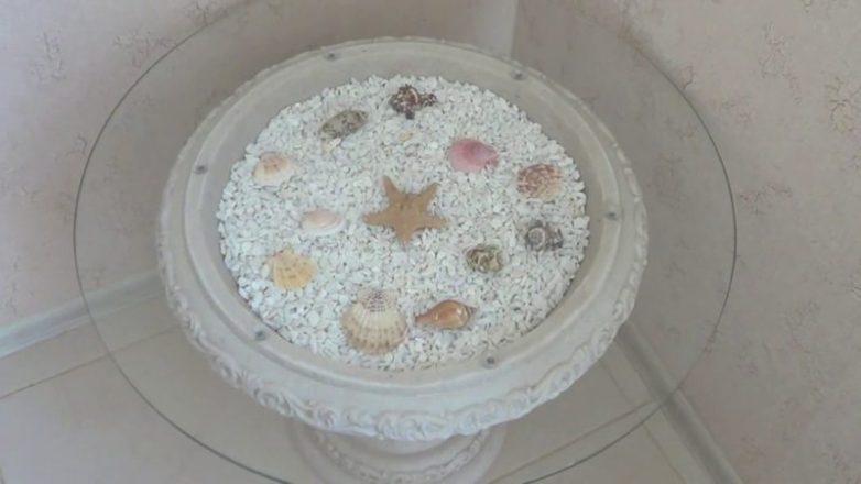 Внутрь насыпать декор, по своему усмотрению. Это может быть всё, что угодно: стекляшки, бусины, верёвочный декор, искусственные цветы и т. п. В данном варианте использовалась мраморная крошка и ракушки в морском стиле. Сверху установите на присоски стекло по размерам.