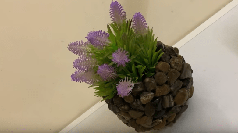 Затем просто выкладываем камни на поверхность шарика и склеиваем их между собой, не приклеивая при этом к самому шарику. Таким образом наращиваем стенку необходимой высоты. Сдуваем шарик, вынимаем его из горшка и оригинальный горшок или ваза готова! При желании камни можно также покрасить или еще как-нибудь задекорировать.