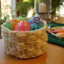 Вязаная корзинка из плотных синтетических ниток может стать не только удобным органайзером, но и самодостаточным элементом декора.