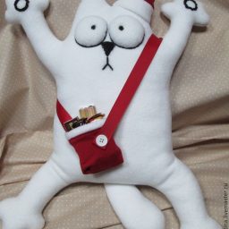 Дети, да и не только, обожают этого кота. А в таком одеянии эта игрушка будет желанным подарком на Новый год! Тем более, что в сумочке у котика припрятаны вкусняшки.