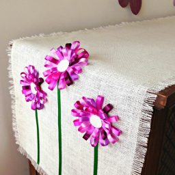 Посмотрите, как можно украсить мешковину цветами из шелковых ленточек. Получилась интересная салфетка для камода. Если у вас нет мешковины, можно использовать лен, двунитку и так далее.