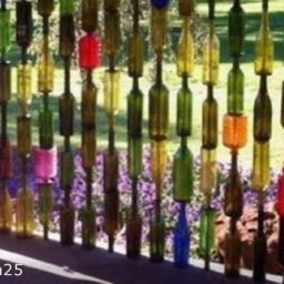 Стеклянные бутылки, особенно цветные, могут быть креативно использованы в саду, на даче в качестве декора. Из таких красивых стеклянных бутылок можно сделать забор, обрамление для цветочной клумбы, ширму на террасу, даже дорожку в саду.