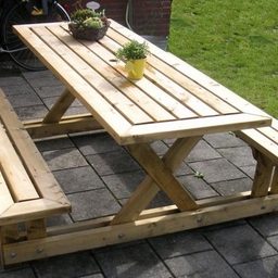 Это отличный монолитный комплект стола с двумя лавочками. Конструкция обеспечивает надежную опору, благодаря чему все стоит ровно и очень крепко. При желании такой комплект можно собрать за несколько часов.