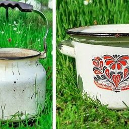 Старые чайники и кастрюли времён СССР у многих лежат без дела. Попробуйте переделать их в нужные вещи для участка! После переделки они будут шикарно смотреться.