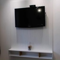 Зону с ТВ, которая обычно располагается напротив кровати или дивана, тоже нужно оформить в соответствии с имеющимся интерьером. Если у вас есть желание сделать что-то необычное своими руками, то предлагаем вам посмотреть идею ниже — это потрясающая декоративная полка из фанеры под ТВ + навесная узкая открытая полочка из ДСП!