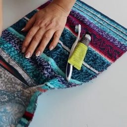 Умная идея для тех, кто часто путешествует на поезде или предпочитает отдыхать на природе в палатках — удобное полотенце с кармашком, в который можно положить зубную щетку, пасту, крем, расческу и другие мелочи для утренней рутины.