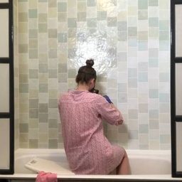 Далеко не все могут позволить себе плитку в ванной. Дорогой не только материал, но и работа. Если вы хотите существенно сэкономить и всё-таки получить достойный результат, то забирайте идею ниже! Мастерица подошла к вопросу креативно и преобразила ванную комнату своими руками.