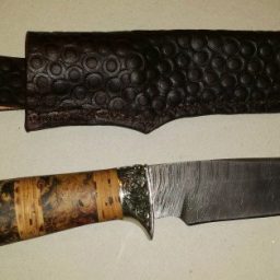 Клинок — сталь Дамаск, больстер и тыльник — мельхиор, рукоять — стабилизированная карельская береза и береста.