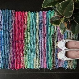 Если вам все-таки хочется использовать старую одежду и обзавестись из лоскутков самодельным ковриком, предлагаю вариант — тканый коврик, с использование картона. Очень даже симпатичная штучка для кухни может получиться, смотрите сами.