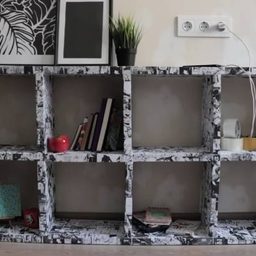 С трудом верится, что такой массивный, просторный, добротный стеллаж собран из обыкновенных картонных коробок! На него можно спокойно ставить цветы, книги и всякую мелочь. Главное — укрепить картонные стенки, чтобы они выдерживали нагрузку и ровно стояли. Великолепная идея из гофрокартона!
