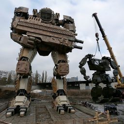 Этих роботов-трансформеров высотой 13 и 6 метров, которых можно увидеть возле автомастерской в Донецке, построили из металлических отходов, включая автомобильные детали. Они весят около 4 и 2 тонн соответственно.